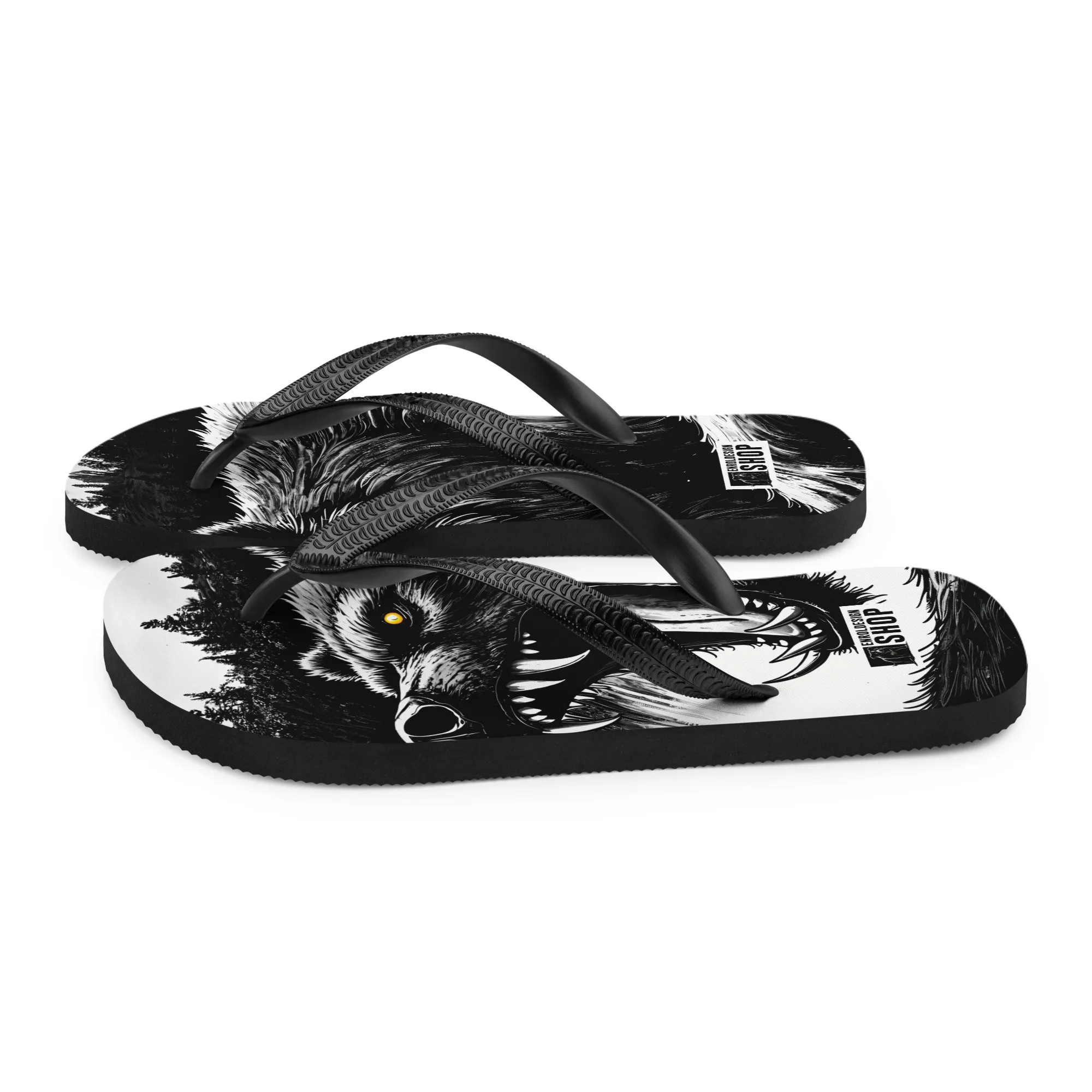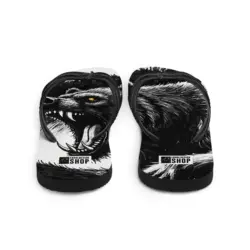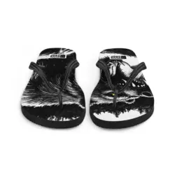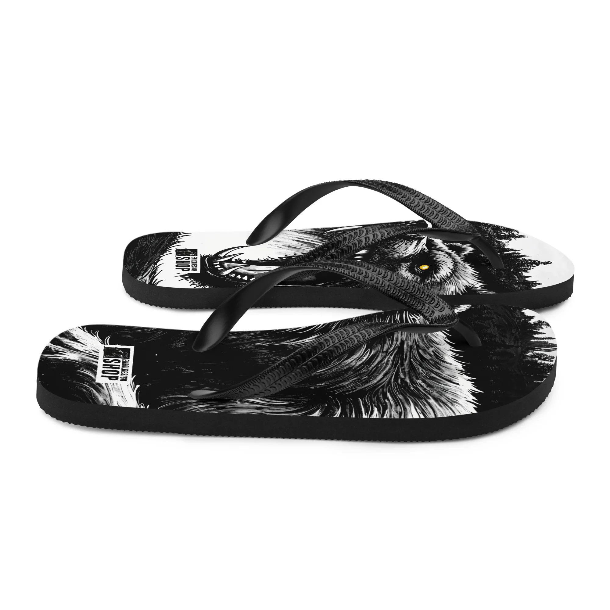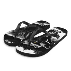 Roh, kraftvoll und auffällig: Die „Wild Bear“ Damen Flip-Flops zeigen ein starkes Bärenmotiv in Schwarz-Weiß-Optik. Bequem, leicht und perfekt für Sommer, Strand, Festivals oder als markantes Streetwear-Statement.